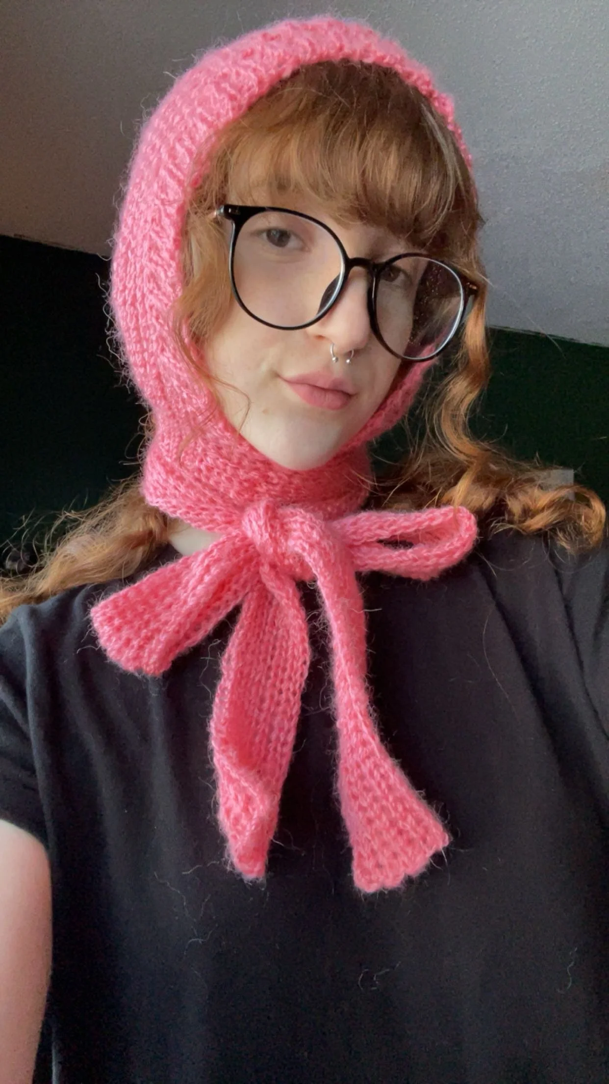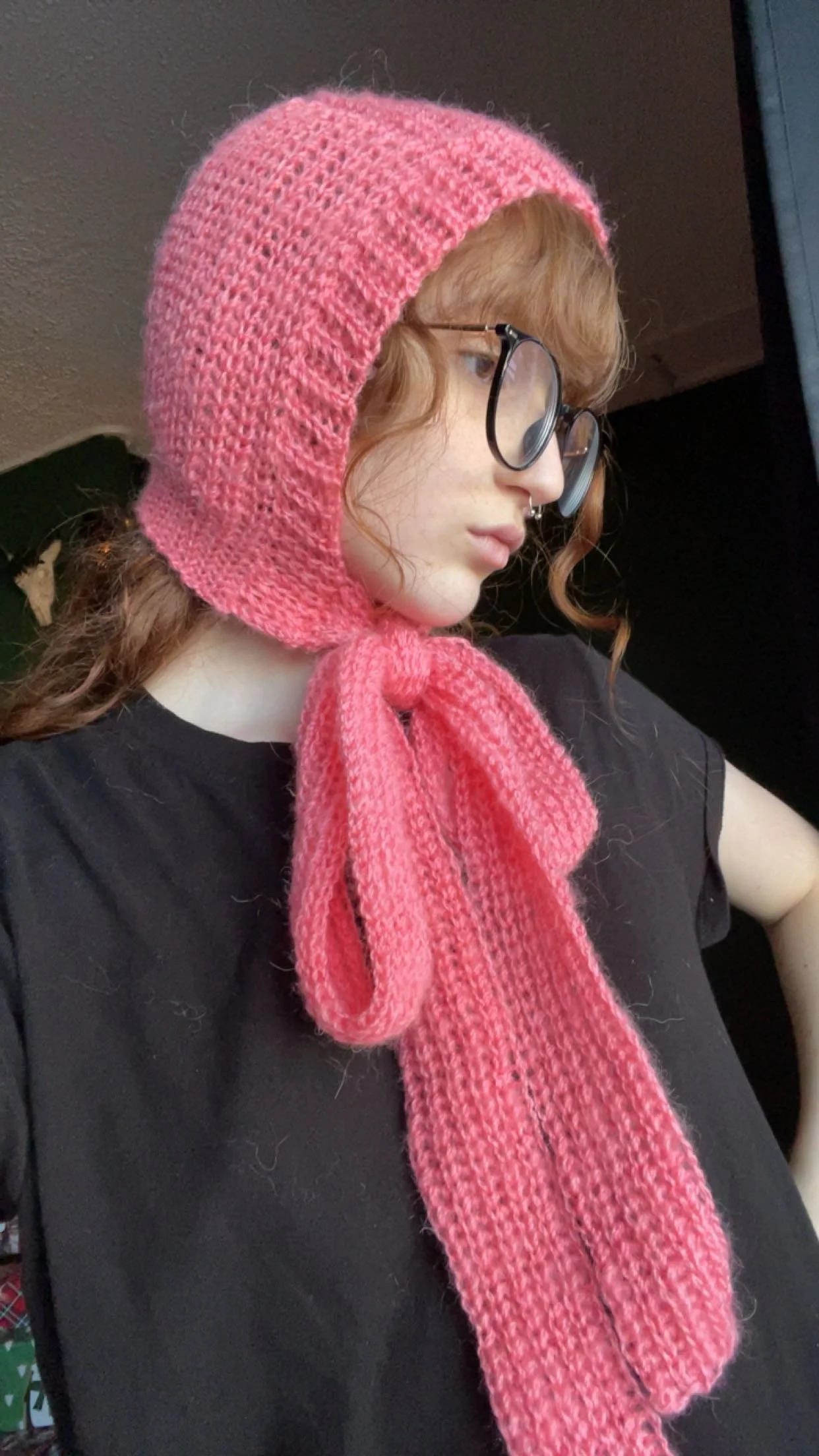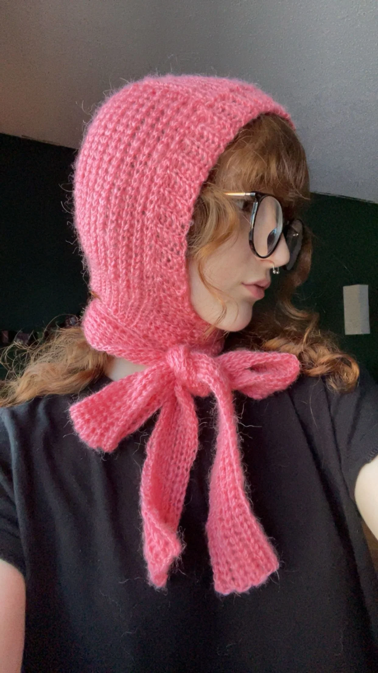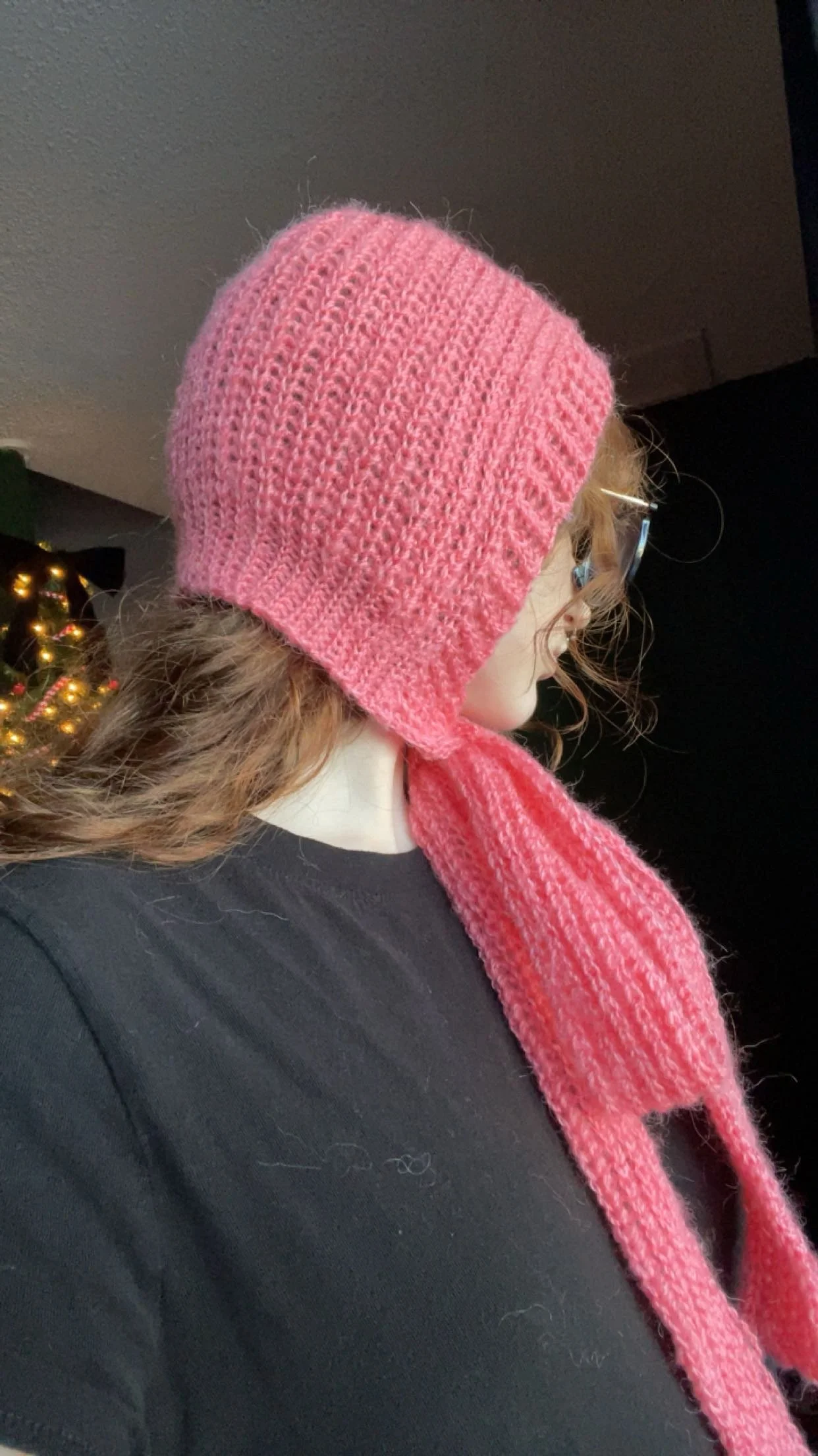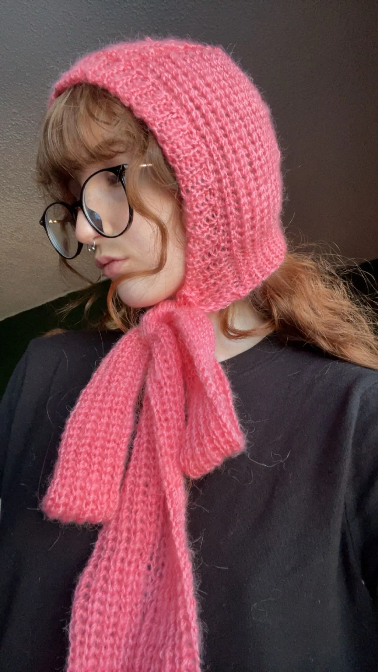 Crochet pink mohair big bow bonnet made with long ties to tie in a bow or wrap around the neck like a scarf and tie into a bow